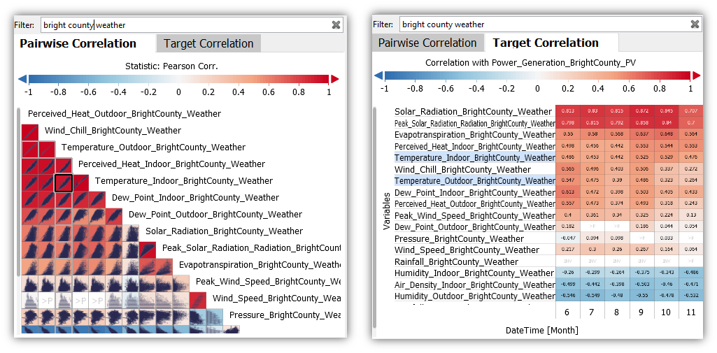 - The target variable can be selected by clicking the label above the color legend (e.g. "Correlation with Power_Generation_BrightCounty_PV" in the image above).