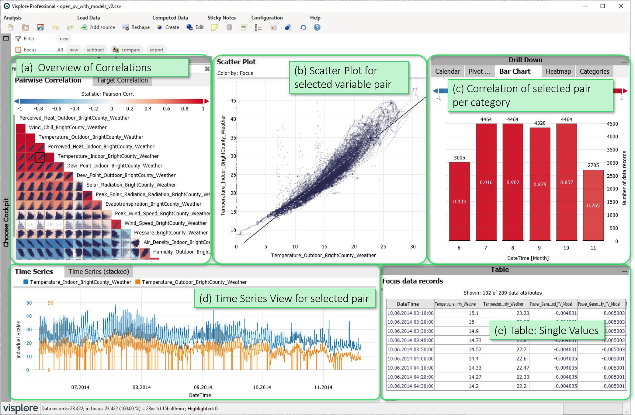 - Correlation of selected pair per category (Drill-Down): The Pearson correlation of the selected variable pair compared for different categories or time periods.