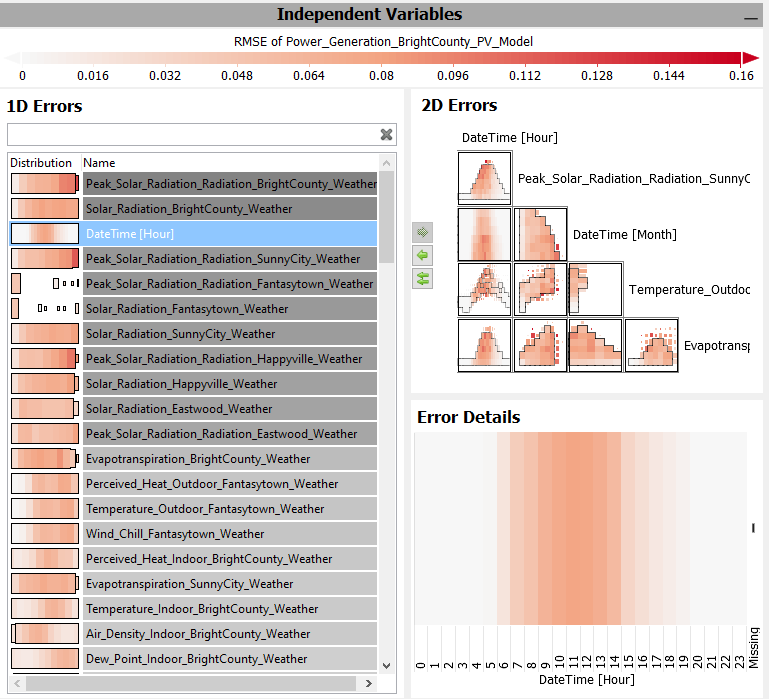 1D Errors: List of independent variables, with color-based visualizations of how the currently chosen error metric depends on the variable. Ordered by the systematicness of the error pattern. View the error pattern in detail by clicking an independent variable. 2D Errors: Matrix of independent variable pairs, with color-based visualizations of how the currently chosen error metric depends on the combination of variables. Ordered by the systematicness of the error pattern. View the error pattern in detail by clicking a cell of an independent variable pair. Select, which variables are shown in the matrix, by selecting them in the 1D Errors, and clicking the green arrow buttons between the 1D and 2D Errors views. Error details: Magnified visualization of the error pattern for the selected independent variable(s). Select any cells (=put them into focus) by dragging the left mouse button, to investigate the remaining variance within the selection in other views. |