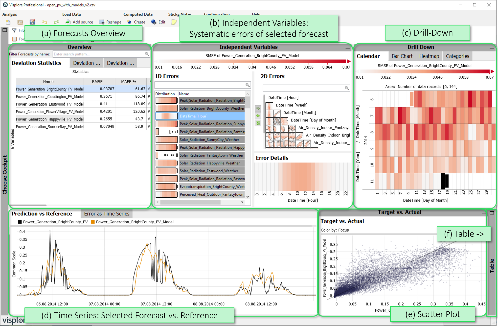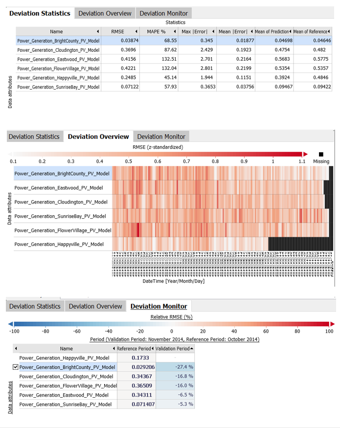 This cockpit visualizes the match between target- and actual value time series, and reveals systematic deviation patterns. The most prominent example is the validation of forecast time series with respect to observed reference time series. Two typical use cases are (1) finding out which forecasts are not good enough for operational deployment and need to be improved, and (2) regular monitoring during operation, to find out which forecasts need to be recalibrated. Systematic error analysis provides ideas on how to improve the forecasts.