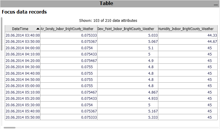 A table showing the single values. Only considers the data records in focus. Click the header of a column to sort the table by it. To change the set of displayed columns, click the header "Shown: 103 of 210 data attributes". Click single rows or drag a line with the left mouse button to select records, putting them into focus.