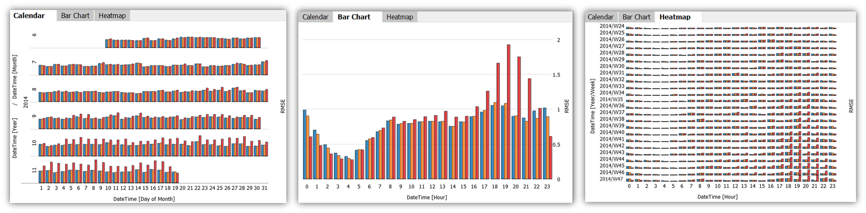 - Calendar: is only available if a Date/Time-typed data column is present. It shows one bar per forecast per day.
