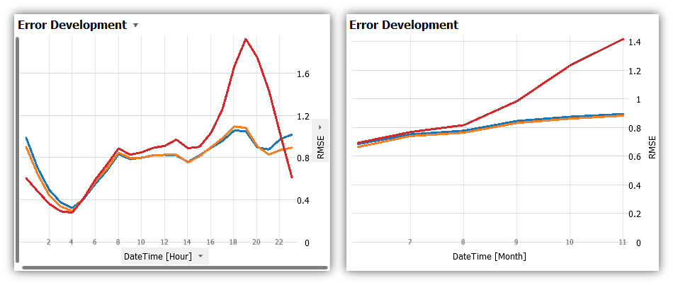 In the images above, you can see for example that forecast 3 (red) has a particularly bad RMSE in evenings, and months after September. In mornings, on the other hand, it has the smallest RMSE.