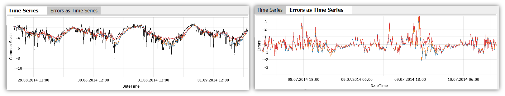 These plots show time series graphs of the forecasts and the reference. The "Time Series" view plots forecast and reference time series as such, while "Errors as time series" shows the residuals (i.e., the differences between forecast and reference) over time.