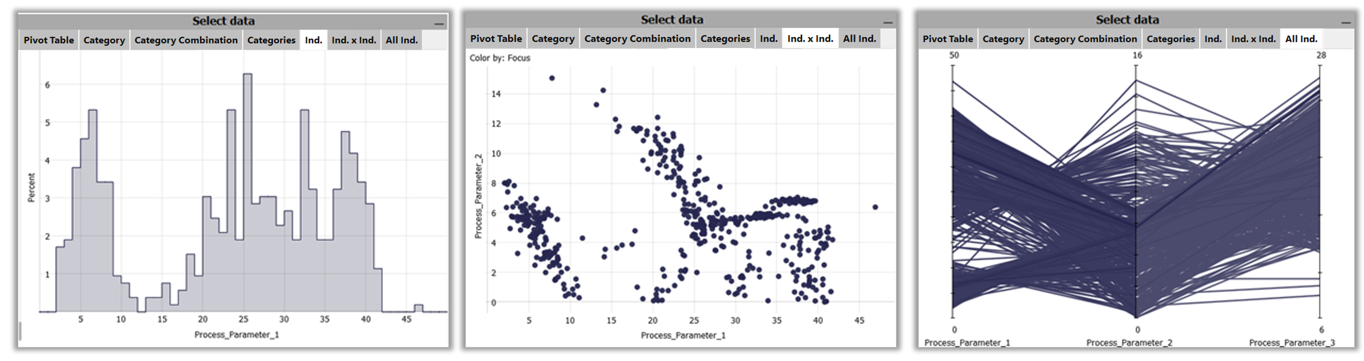 - All Ind.: A parallel coordinates plot of all independent variables to select value ranges for multiple variables. Axes can be re-ordered with drag and drop.