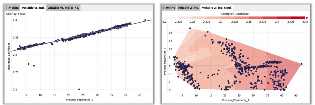 - KPI vs. Ind. x Ind.: Shows one selected variable (selected in 'Select KPIs') as a colored background over two independent variables (select by clicking the labels of the x- and y-axis)