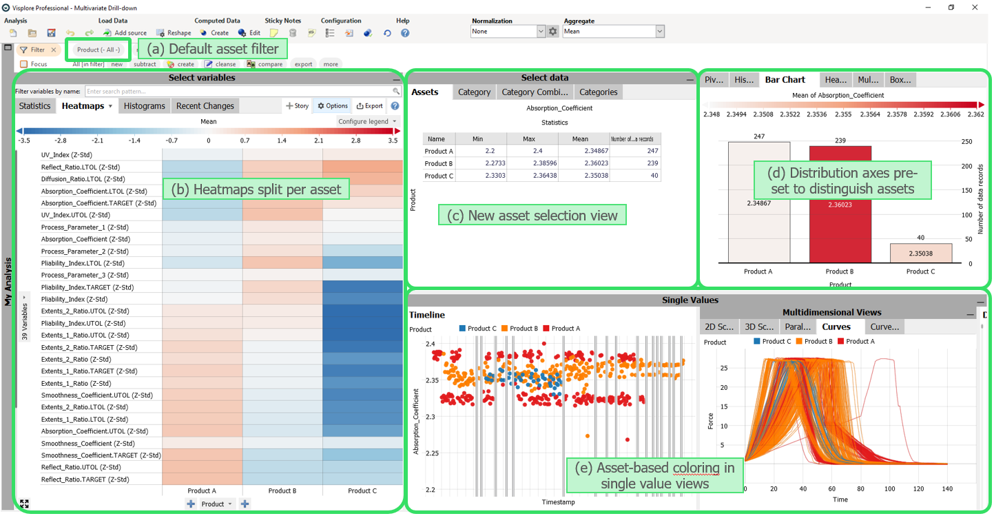 - Heatmaps split per asset: instead of showing the ‘Statistics’ view to select data attributes, the heatmaps view is shown per default, where each column represents one asset.