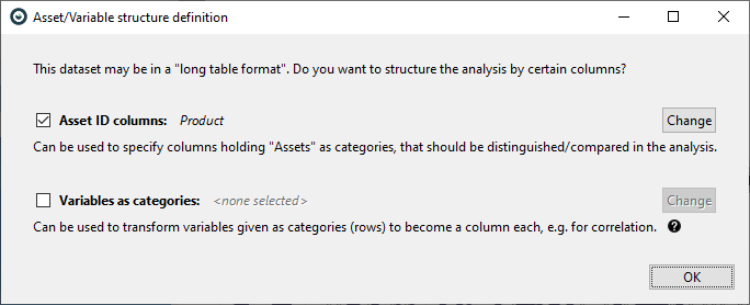 If Visplore finds candidates for Asset IDs or a variable as category transformation in your loaded data set, it prompts you to set it before fully loading it into Visplore, so you can start working on your data with the correct presets from the start. You can still set these options later using the Data Source Manager.