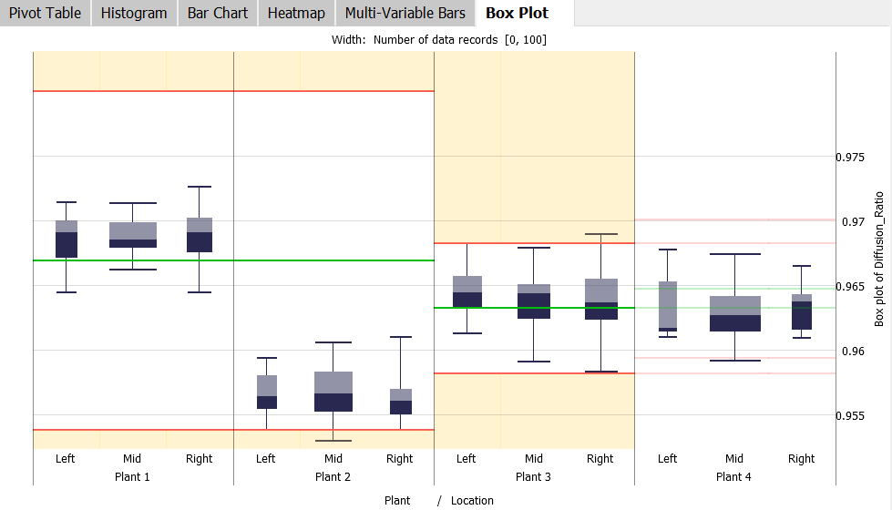 Box plots for the selected variable are displayed in the "Box Plot" view to analyze a variable's distributions by different categories. The subdivision by categories can be set as desired using the drop-down menus in the axis labels. In the example above, box plots are displayed for the measured variable "Diffusion Ratio" per combination of "Plant" and "Location".