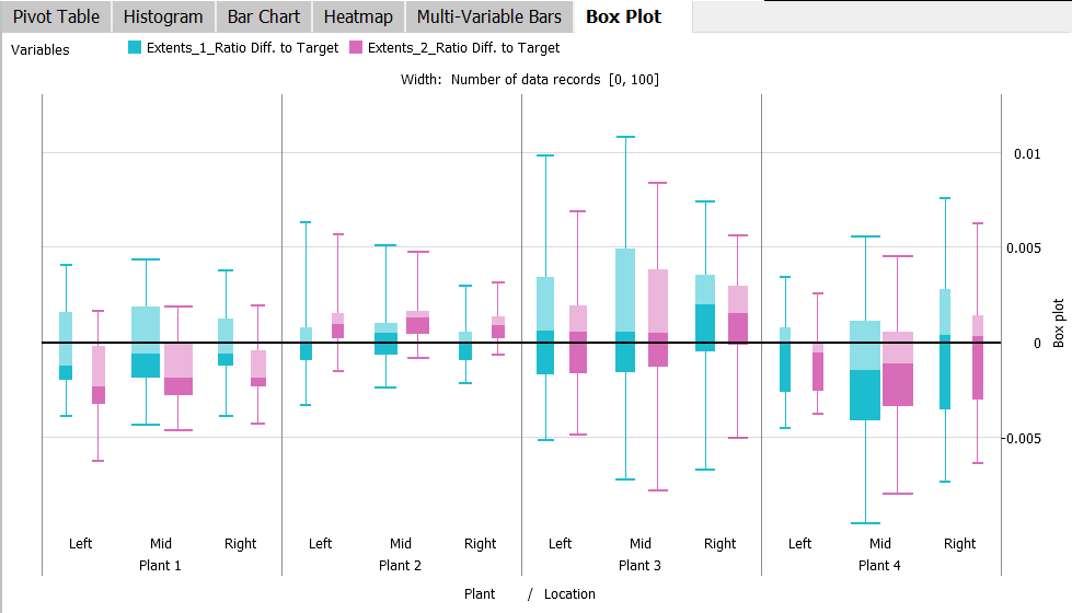 The width of the individual box plots results from the number of values in the corresponding category combination. To compare box plots of different variables, the view shows box plots of multiple selected variables side-by-side, distinguished by color: