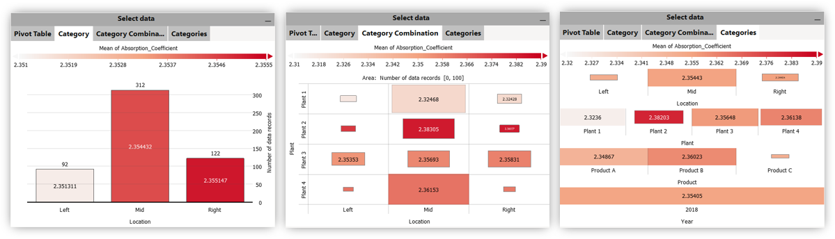 In the views "Category", "Category Combination", and "Categories", you can obtain a summary of the values of the currently selected variable over categories in the data. The chosen aggregation measure determines the color-coding of the views. If, for example, "Mean" is chosen as a measure, the color of the areas shows the mean value of the measured variable for each category of one or multiple categorical data attributes. The categories by which the views are subdivided can be set via drop-down menus accessible via the corresponding axis labels.
