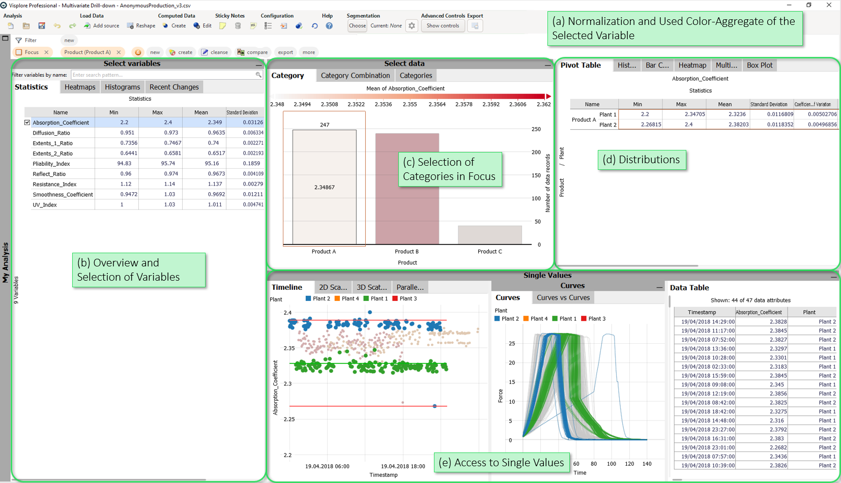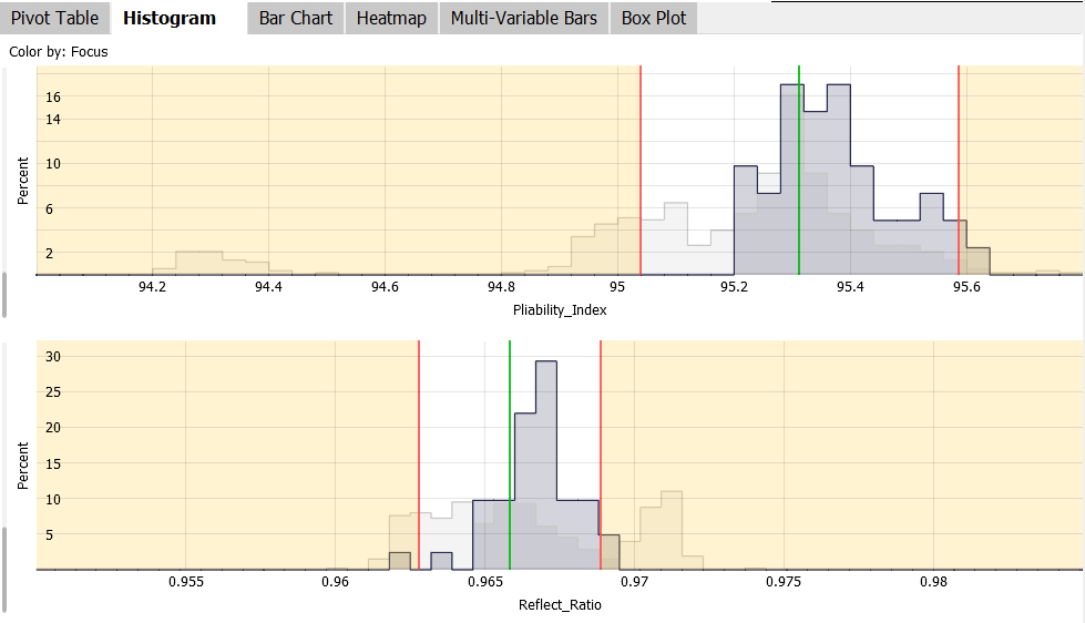 Analyze distributions and trends of numerical variables and quality-related KPIs. Investigate the effect of independent variables on these KPIs. Summarize variables as pivot tables and drill down to single values.