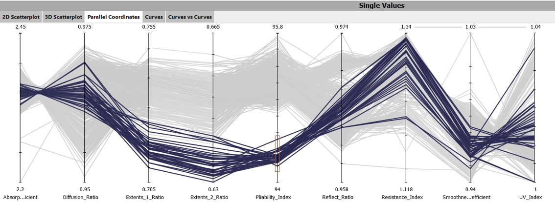 The "Parallel Coordinates" view compares selected measurement variables in a parallel arrangement. The horizontal lines between the two measured values show a point (data line); the values of each line can be read from the parallel axes. The brighter the lines, the fewer points at the corresponding values. This allows you to determine in which areas values are located, at which points the most are concentrated, and to what extent the compared measured variables correlate.