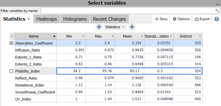 The views "Statistics", "Heatmaps", "Histograms", and "Recent changes" provide an overview of the variables available for the analysis (role "Variable"). Selecting a variable in one of these views means that all other views in the entire cockpit now refer to that variable. For example, the "Timeline" view now shows the time series of the selected variable.