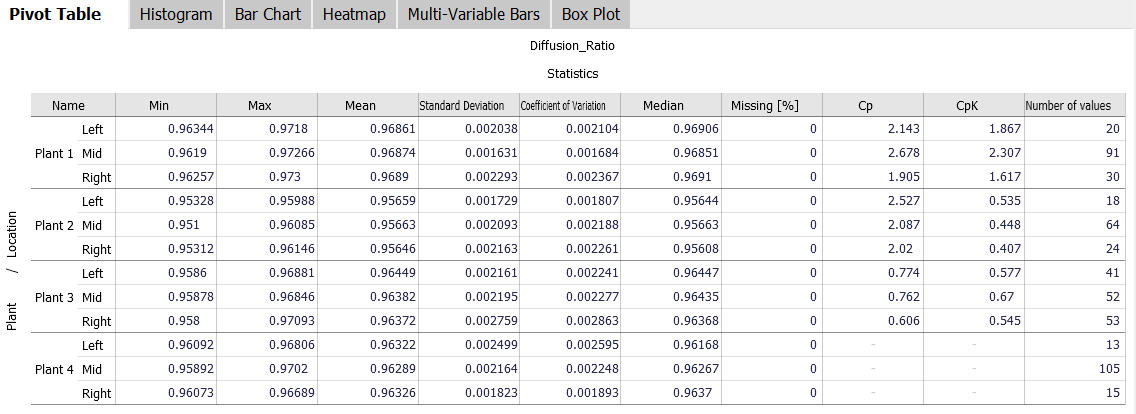 In the example above, a pivot table for the variable "Diffusion Ratio" was created with a few clicks, which was subdivided on the Y-axis by "Plant" and "Location". A configured pivot table can be exported to the clipboard or a CSV file via the corresponding view options (click on "Export" in the top right of this view), imported, and further used in other programs such as Microsoft Excel.