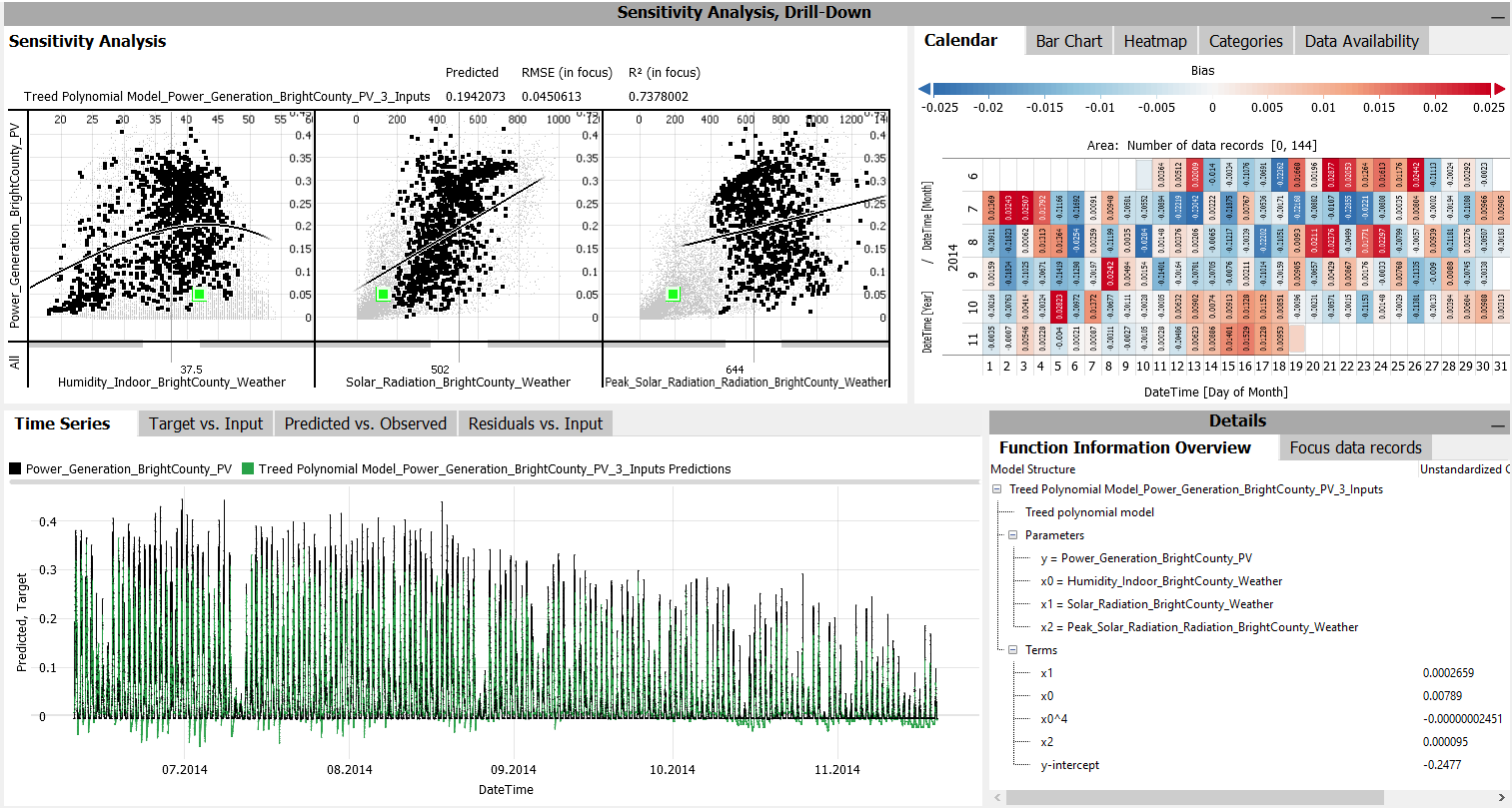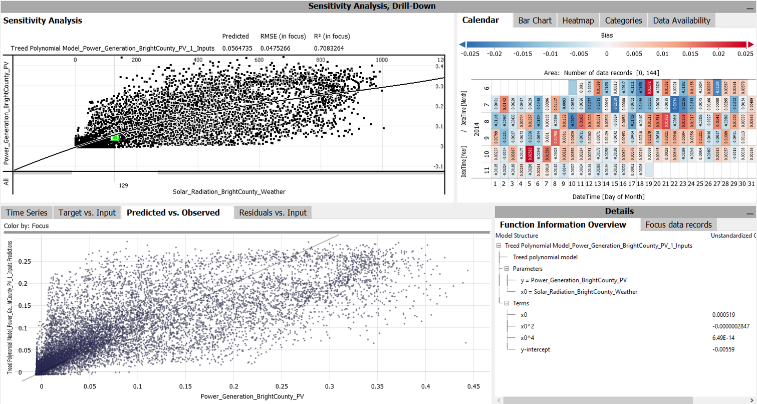 The "Sensitivity Analysis" shows the function graph of the model. The "Drill-Down" views like the Calendar show the model bias (systematic over- or underestimation) using colors. The "Predicted vs. Observed" view plots predictions and actual values, where an ideal fit would be points on the diagonal line. The "Function Information Overview" shows the model definition along with its coefficients":