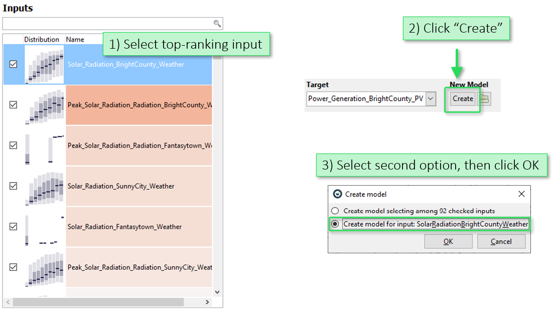 In the "Inputs" view, select the top ranking feature with a click, then press the "Create" button in the toolbar of the cockpit. In the dialog, select the second option to build a polynomial model based on the selected feature:
