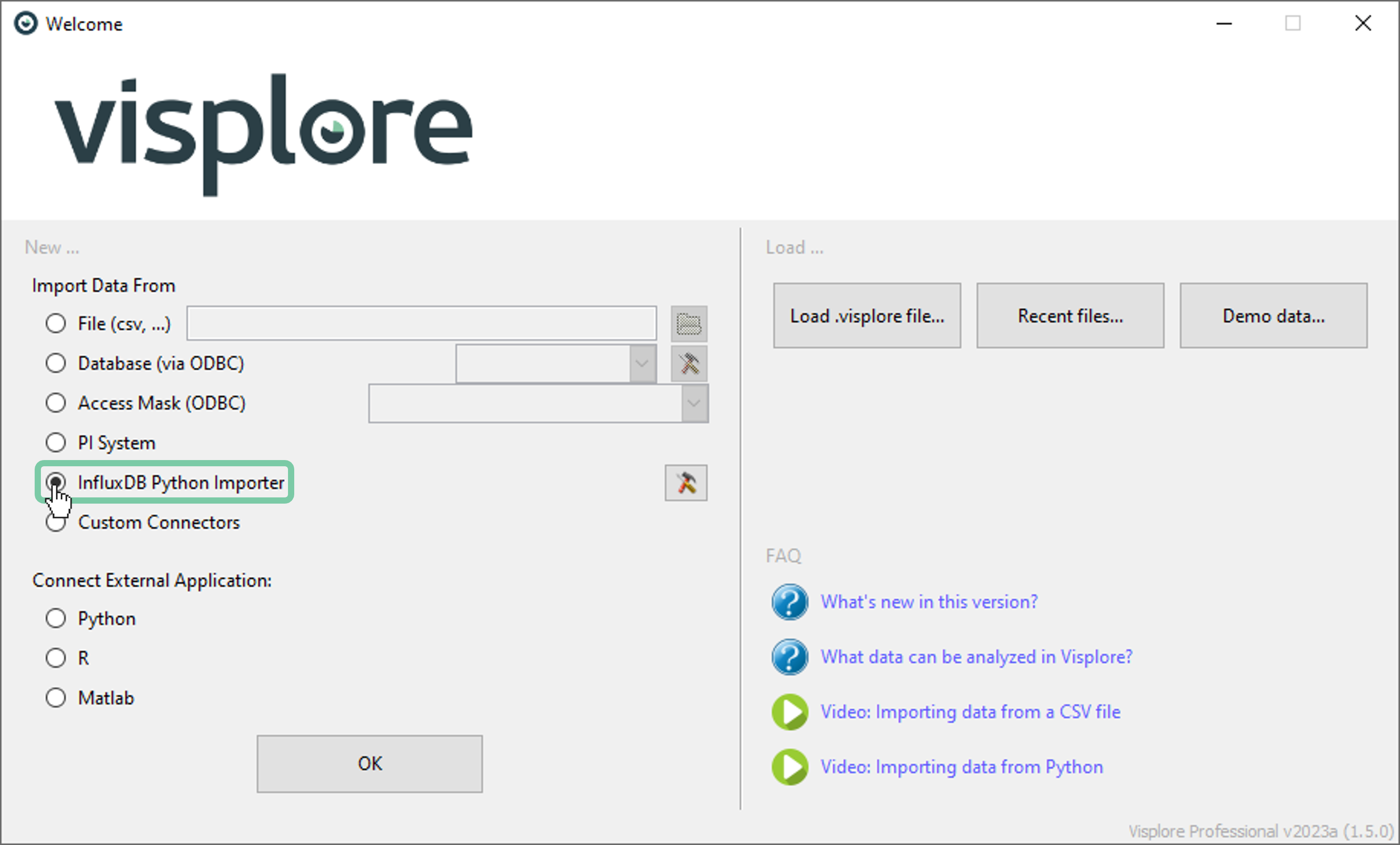 Setting up a connection to an InfluxDB database in Visplore is easy. Start Visplore and select “InfluxDB Python Importer” in the welcome dialog.