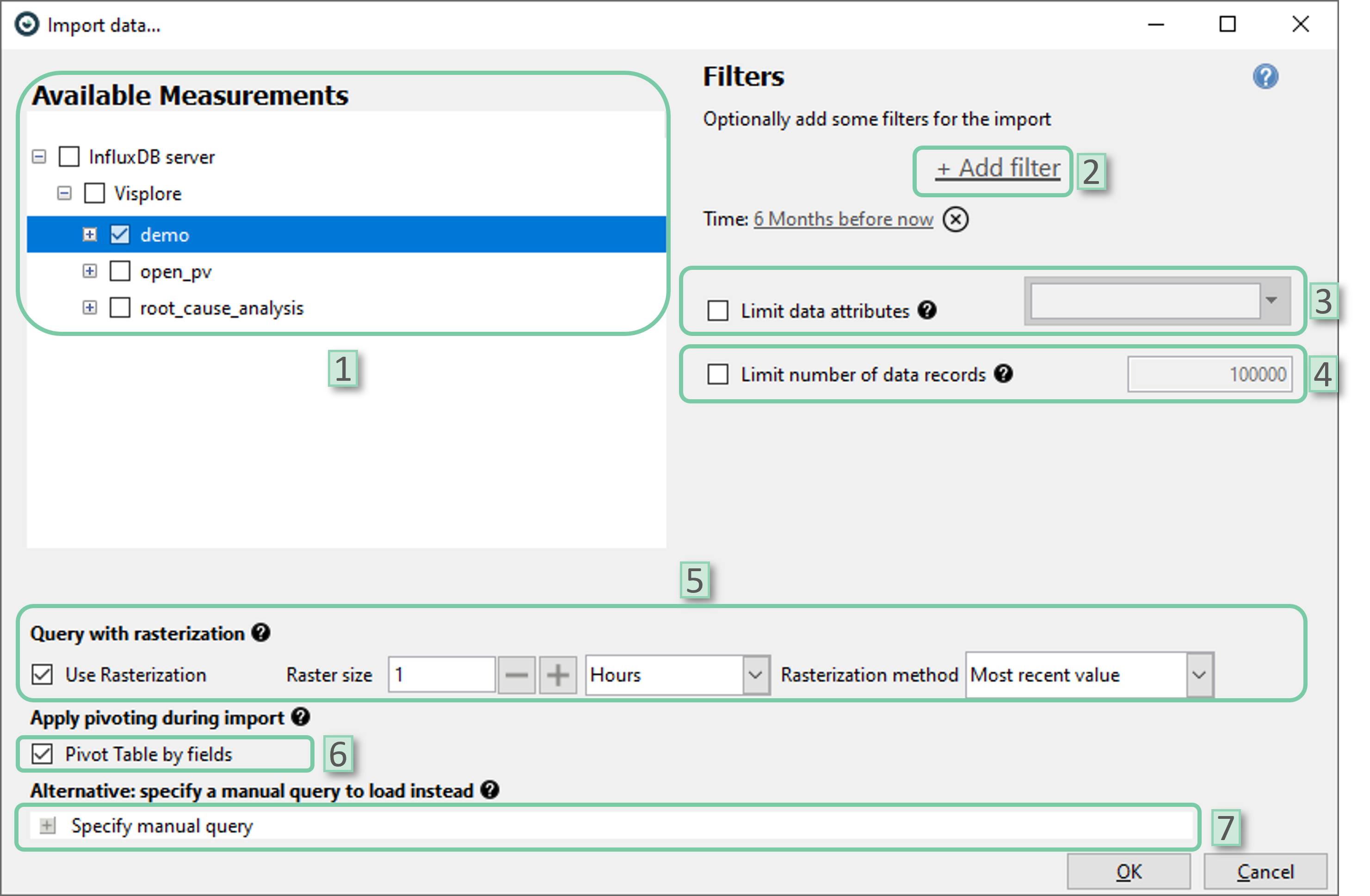 - 7. Specify manual query: The user can apply custom import settings via a flux code. This automatically disregards any other import setting provided via the user interface.