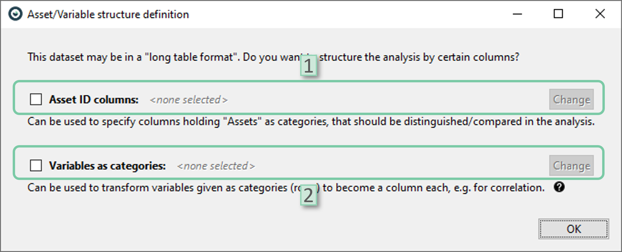 After clicking ‘OK’ in the ‘Import data…’ window, depending on your data structure, ‘Asset/Variable structure definition’ window might pop-up.