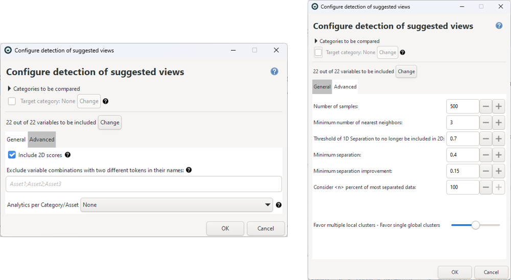 This dialog lets you configure how Visplore suggests the most relevant 1D and 2D views during a comparison workflow — for example, when comparing operational states, process outcomes, or user-defined selections.