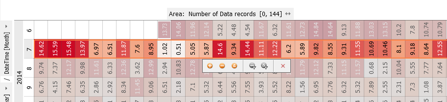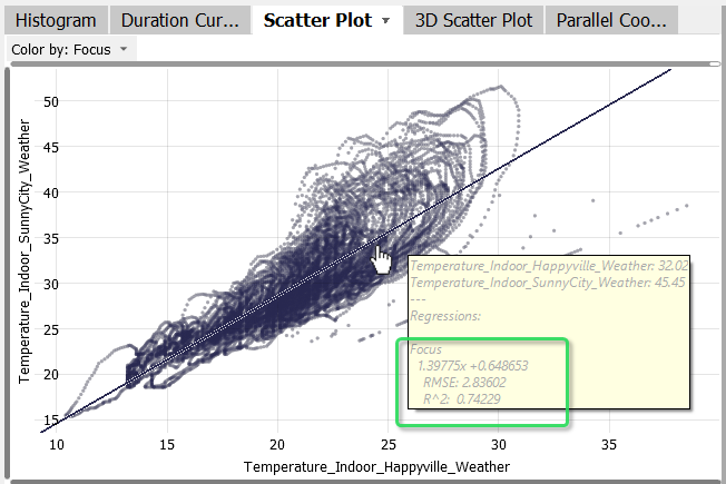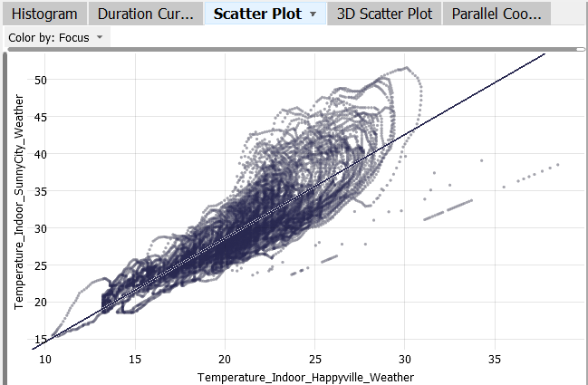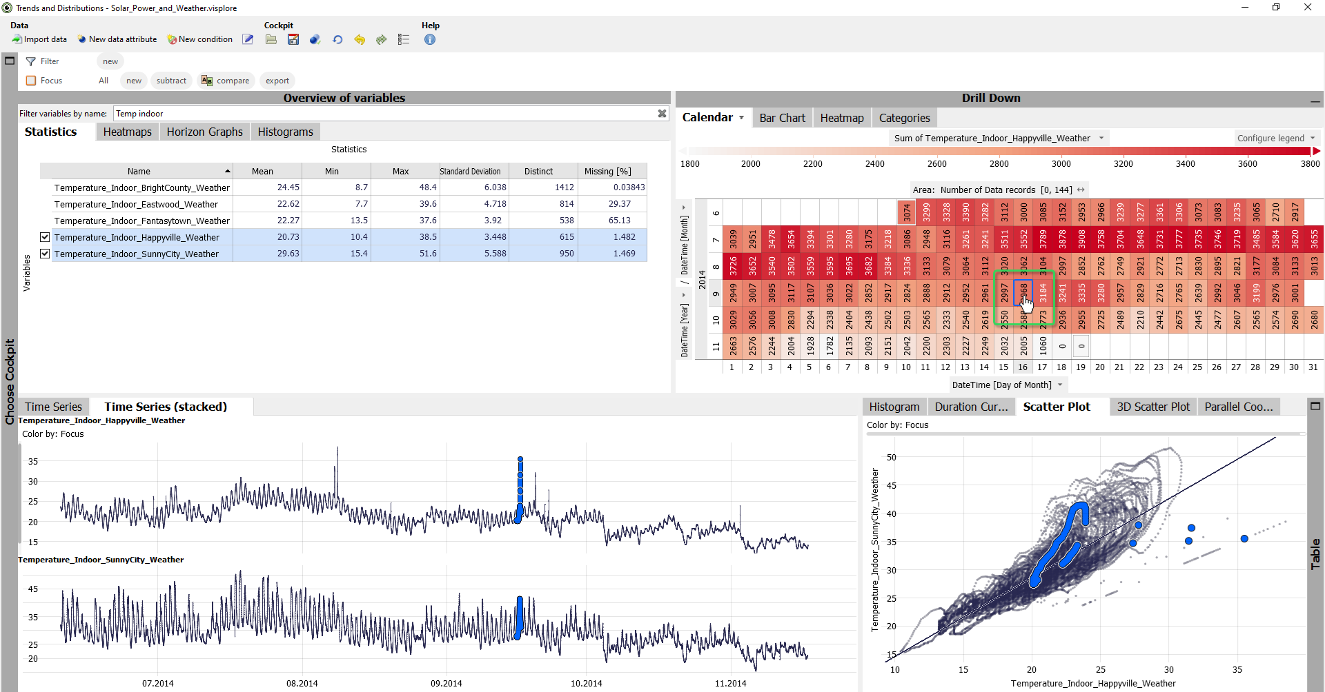 The data of the corresponding days is highlighted in the "Scatter Plot" (as well as in other views like the "Time Series"). This way, a relationship between a time period and a value distribution can be seen very rapidly.