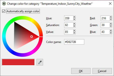 Click on the colored square next to one of the time series names to change its color in a dialog: