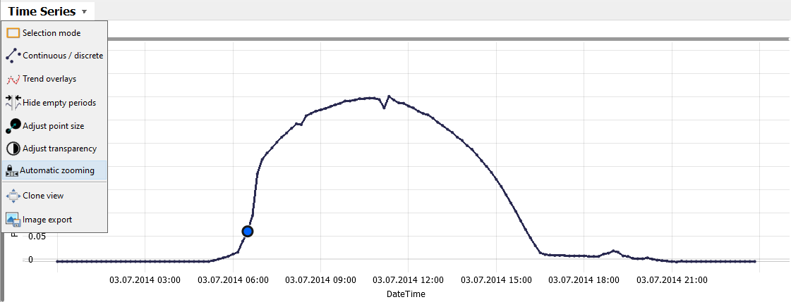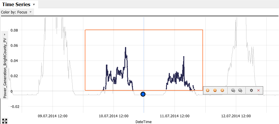 As discussed in the last section, you can zoom in on areas of interest, e.g., by dragging a rectangle with the right mouse button. Doing this shows that July 3rd had no extreme maximum, but an continously high production. You can also make the Time Series view zoom in automatically when defining a new focus: