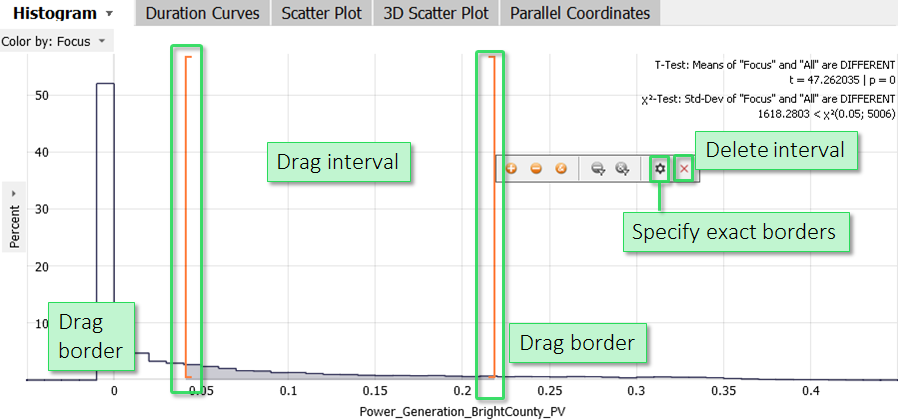 This selects all records, where the value of the displayed time series belongs to the drawn interval (here: "Power_Generation_BrightCounty_PV"). You can adjust the interval at any time: