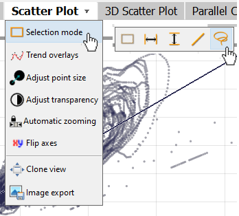 Click the view title "Scatter Plot", then "Selection mode". From the options, choose the one shaped like a lasso (see image). With the Lasso tool, drag a shape with the left mouse button that contains the points in the line pattern (see image below). |