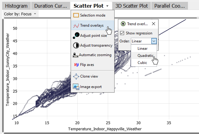 In the view menu (click the view title "Scatter Plot"), you can configure the visualization like flipping the axes, or changing the degree of the regression polynomial to see nonlinear relations.