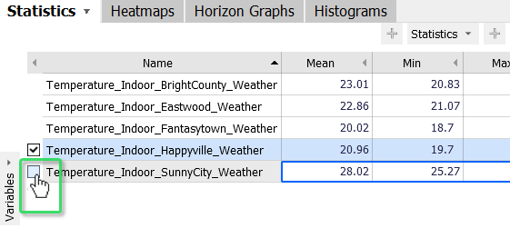 Let's consider temperature time series. Type "Temp indoor" in the "Filter variables by name" field of the Overviews. Then, select "Temperature_Indoor_Happyville_Weather".