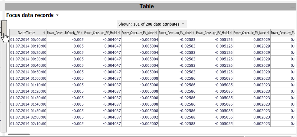 This opens a data table view, showing the data records that are currently in focus. Specifically, when you have not specified a focus, all rows are in focus, and thus shown in the table. Use the scrollbars to navigate in the table, or use the mouse wheel for vertical scrolling.