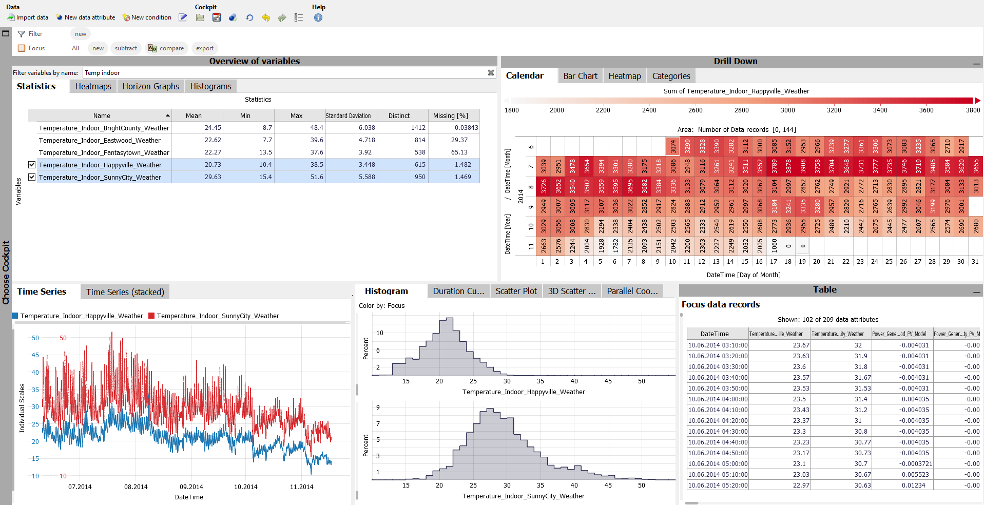 Once the line patterns are selected, the other views provide interesting information on these records. It is 52 records (see statusbar at the bottom). Their temporal distribution is evident from the calendar, as well as from the "Time Series (stacked)" views. The points seem to correspond to the spikes from the "Temperature_Indoor_Happyville_Weather" time series. The table in the lower right shows that the value for the two time series seems to be identical at these 52 points. This is confirmed by the statistics for the two time series in the overview (top left). Apparently, this seems to be a data artifact.