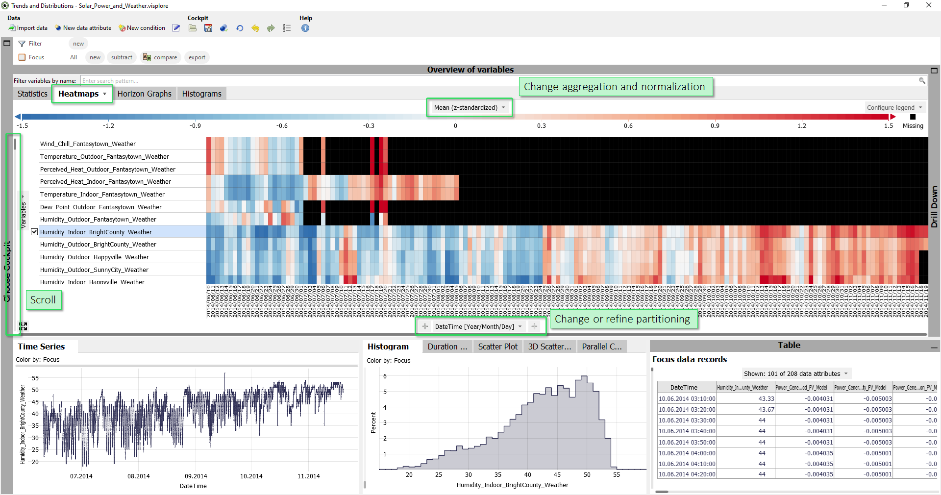 Most importantly, when a focus is defined, the list of time series is automatically ordered by how much the distribution of the focus differs from the rest of the data. This is useful for finding possible reasons for certain patterns that you select.