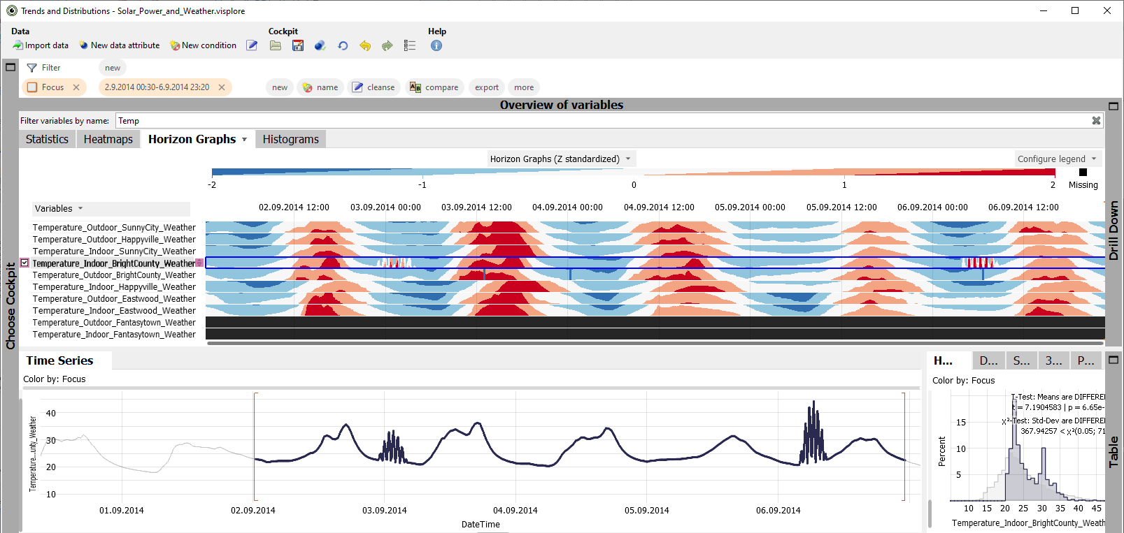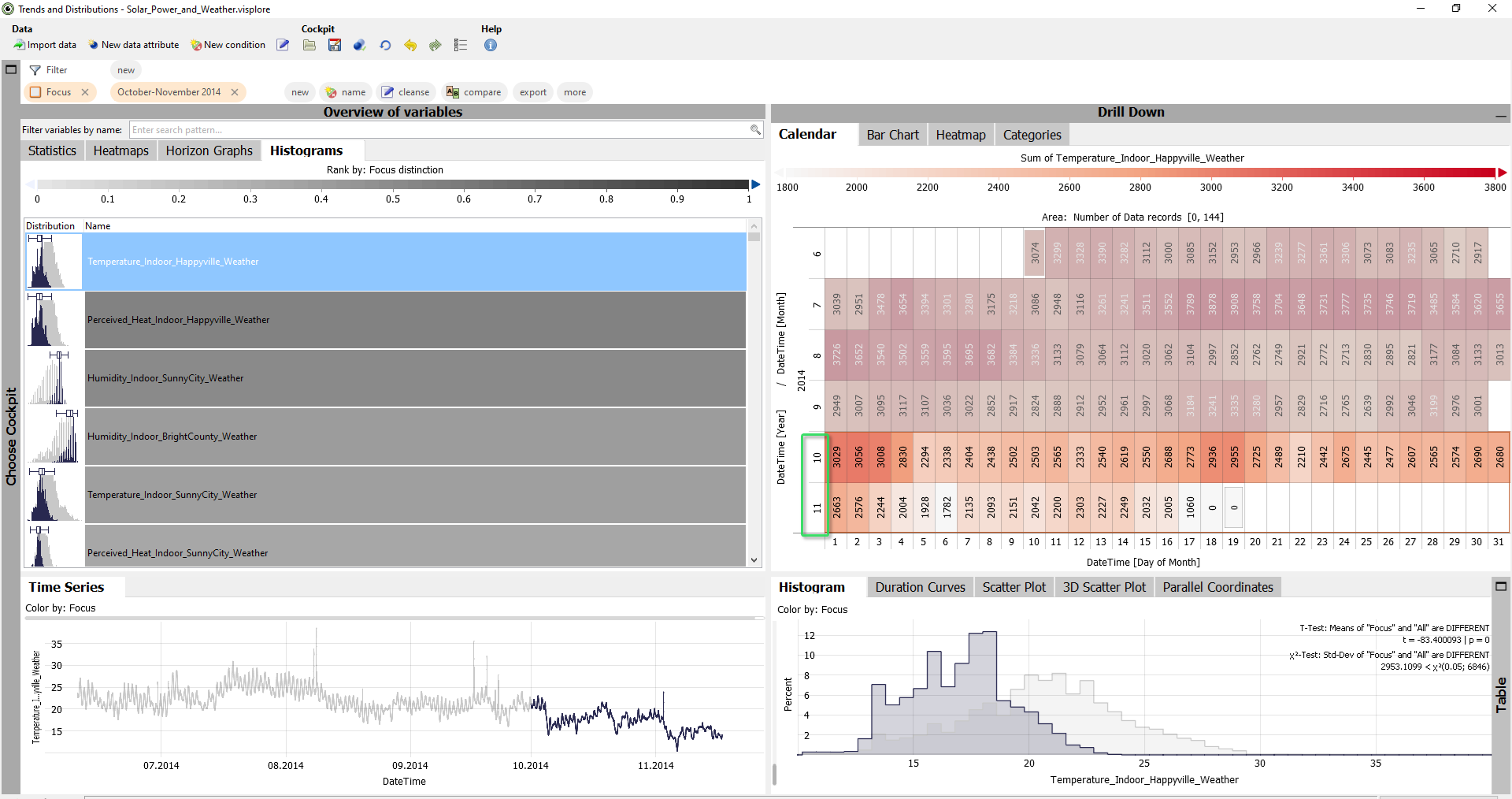 As a result, the "Histograms" of those time series are ranked top, that have extraordinary value distributions in October and November. Here, these are certain temperature and humidity time series: