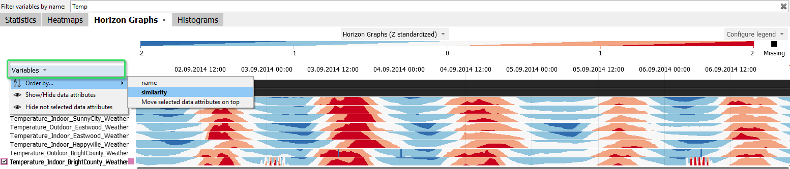 Order the list of time series by similarity, by pressing the "Variables" button on the left, then "Order by / similarity". As a result, time series with similar patterns are arranged next to each other. This reveals groups of similar time series.