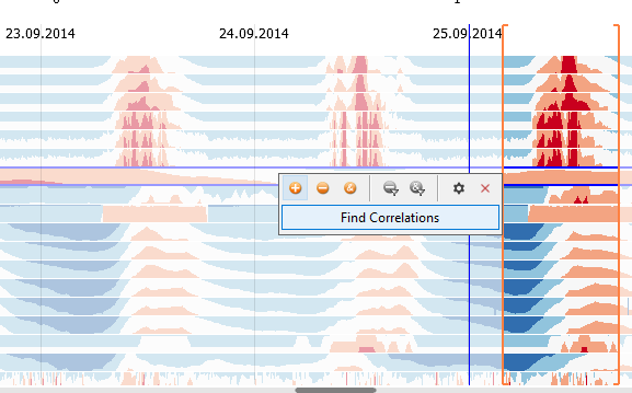 - Finding correlations with a specific pattern of one time series: Select a time period of one time series by dragging a line with the left mouse button in the visualization of one time series (important to stay within the one row and not touch others with the line). Then, press "Find Correlations" that appears next to the orange selection rectangle. This orders all time series by their correlation to the selected pattern in the selected time period. This is particularly useful for finding possible explanations: