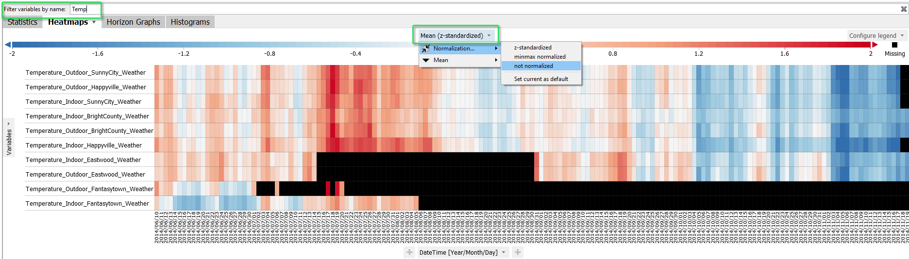 - Switch the normalization of the time series off when you have similarly scaled time series, by clicking the color legend label "Horizon graphs (z-standardized"), then "Normalization / no normalization".