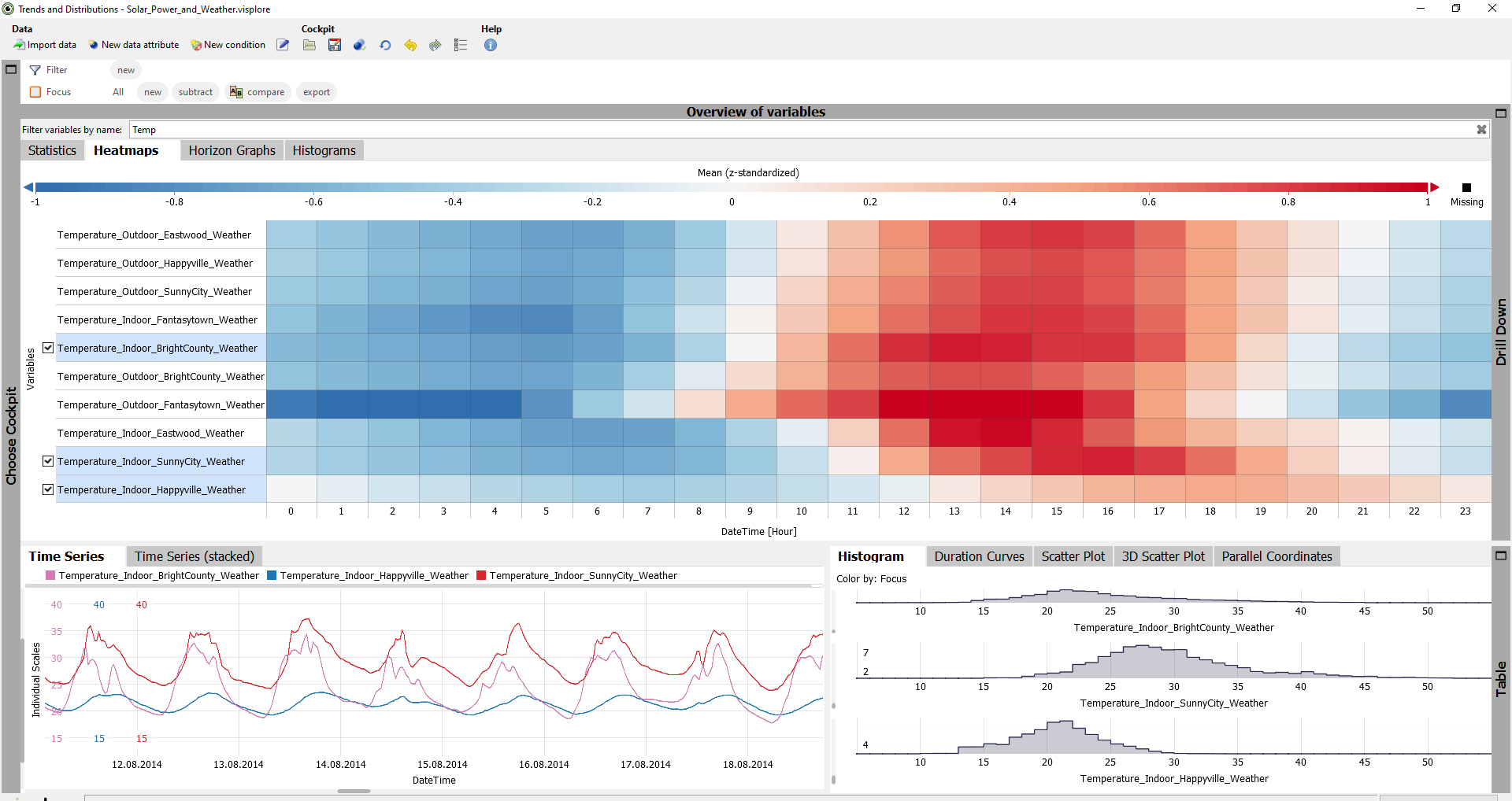 Another helpful overview can be found in the "Histograms" tab. Here, the distributions of the time series are shown using small histograms.