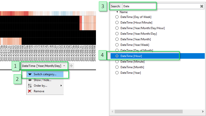Moreoever, the partitioning of the x-axis can be changed. For example, average day patterns may be interesting for the temperature time series. Click the lower label of x-axis "DateTime [Year/Month/Day], then "Switch category". From the list of data attributes, select "DateTime [Hour]" to partition the axis by the 24 hours of the day. (You may need to scroll down a bit to find "DateTime [Hour]", or use the text filter to search for "hour" in the dialog.). |