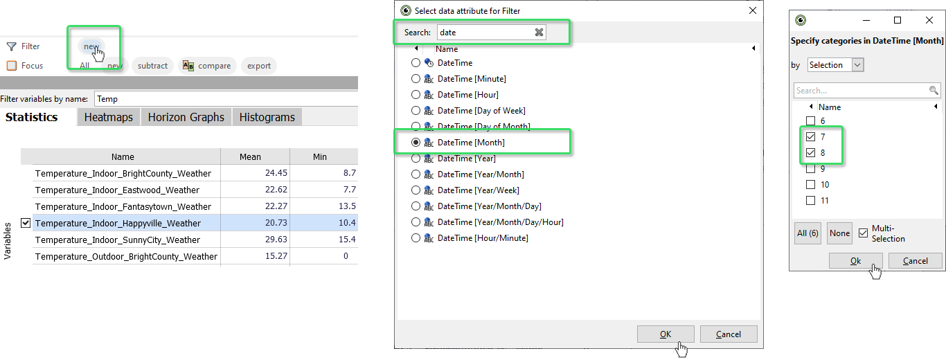 Press the "new" button of the filter bar on top of Visplore, then type "date" to filter the list, and select the data attribute "DateTime [Month]". Press ok. Next, mark the checkboxes of the months 7 and 8, to keep just July and August. You immediately see the effect on the whole cockpit. Press OK to confirm.