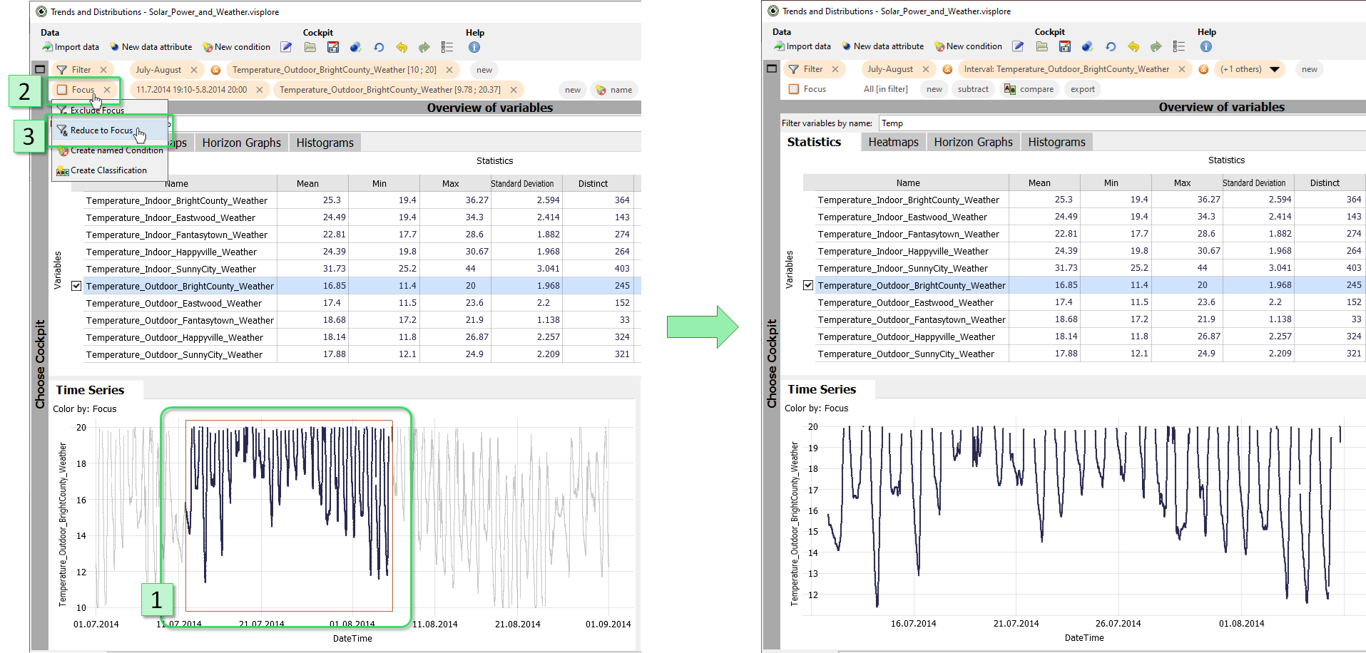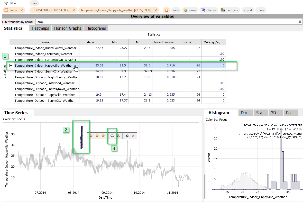 Select the time series "Temperature_Indoor_Happyville_Weather" in an overview (left click on the name in an overview like "Statistics"). Clear the focus (DELETE key), if any, and make sure the "Time Series" view is zoomed out (button in lower left corner).