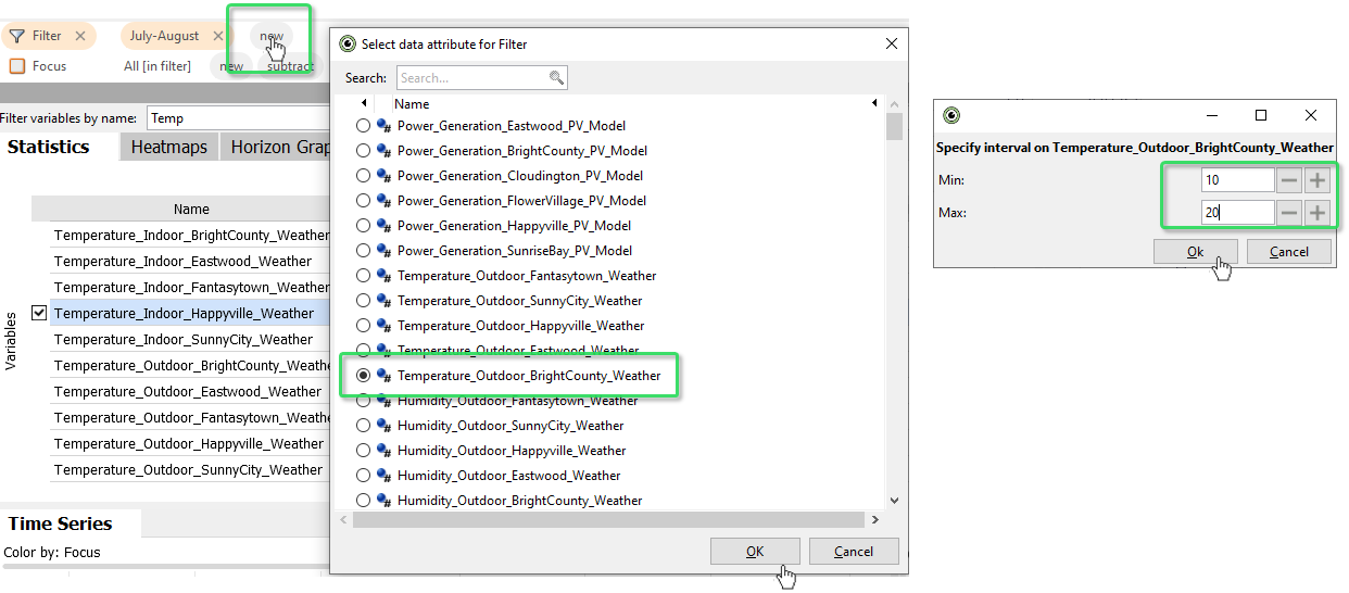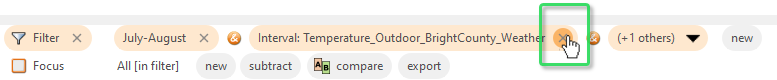 Use the "new" button in the filter bar, to refine the filter further. Choose the time series "Temperature_Outdoor_BrightCounty_Weather", then specify the interval 10 to 20 (degrees) to keep. Select the time series "Temperature_Outdoor_BrightCounty_Weather" in an overview, to look at it. Now only times are analyzed, where the temperature sensor was in that interval, between July and September.