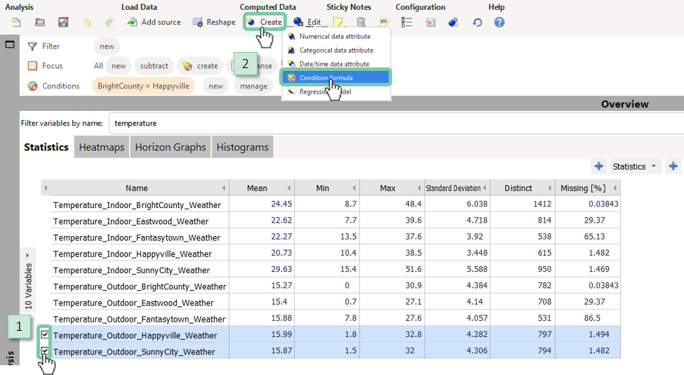 1. Select variables “Temperature_Outdoor_Happyville_Weather” and “Temperature_Outdoor_SunnyCity_Weather”
