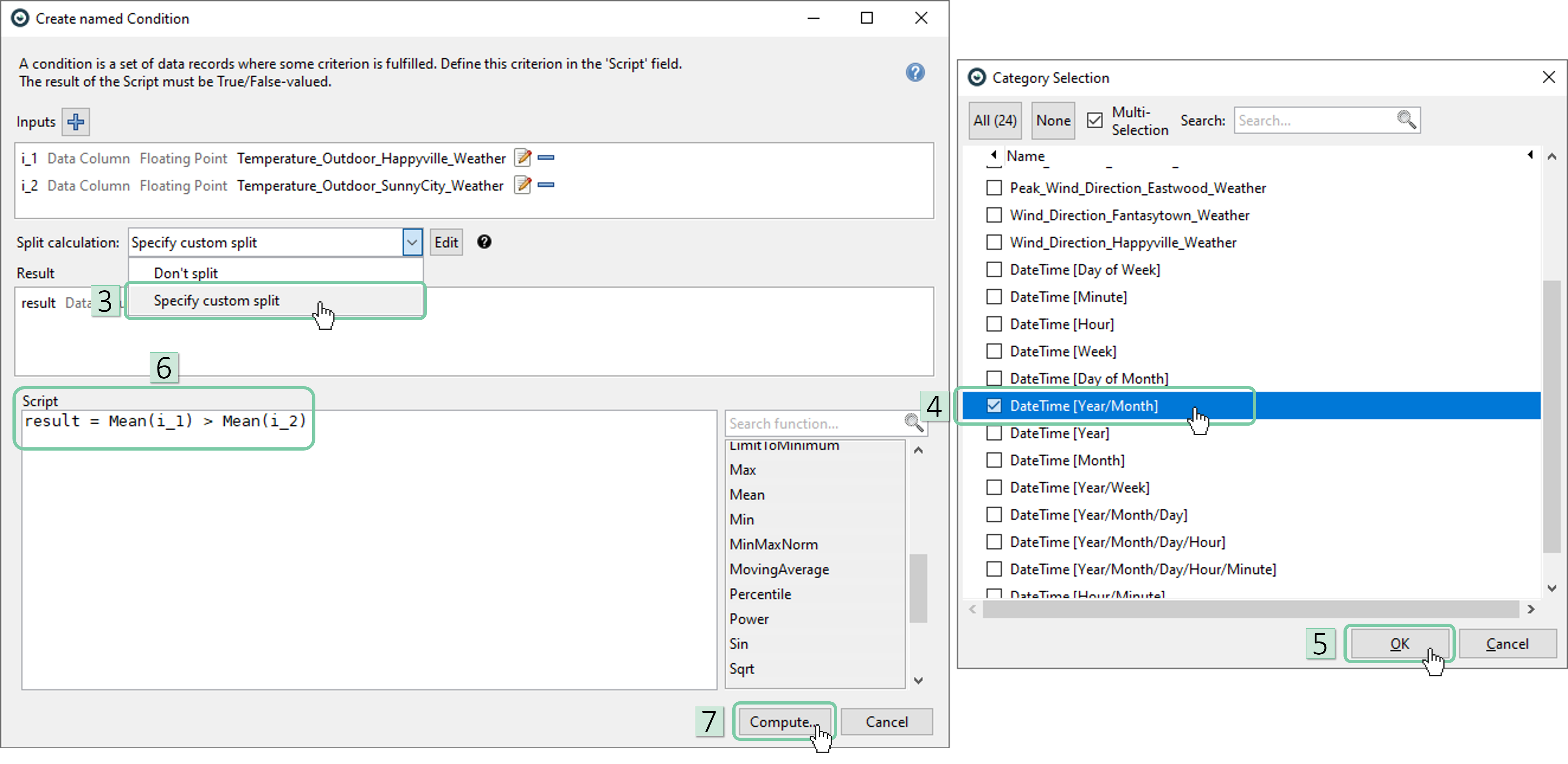 It is also possible to define a condition per category or category combinations. In this example, the aim is to create a condition that returns true if the average monthly outdoor temperature at HappyVille is higher than SunnyCity.