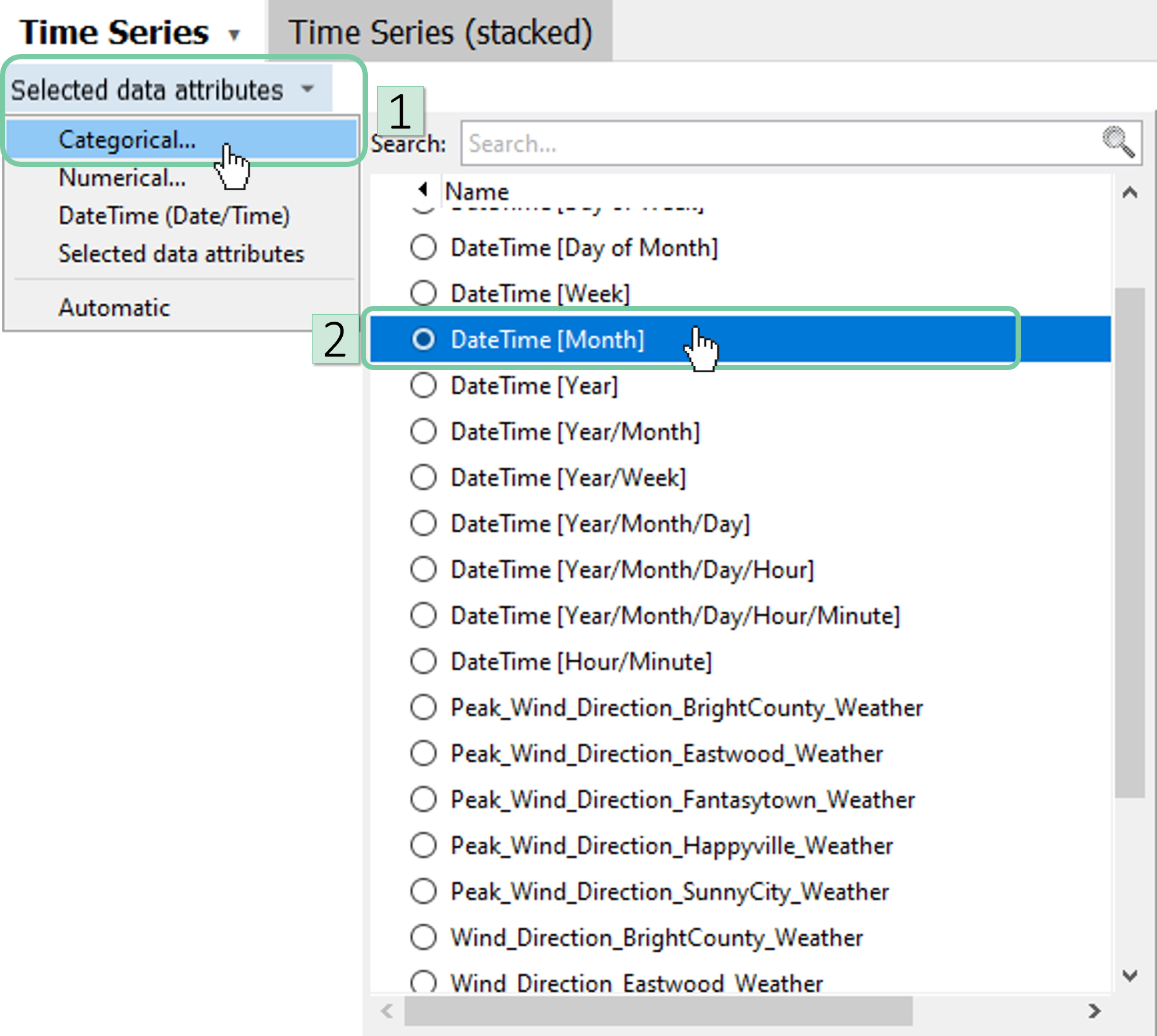 1. To better illustrate that, click “Selected data attributes” in the “Time Series” view and select “Categorical…” from the drop-down menu.